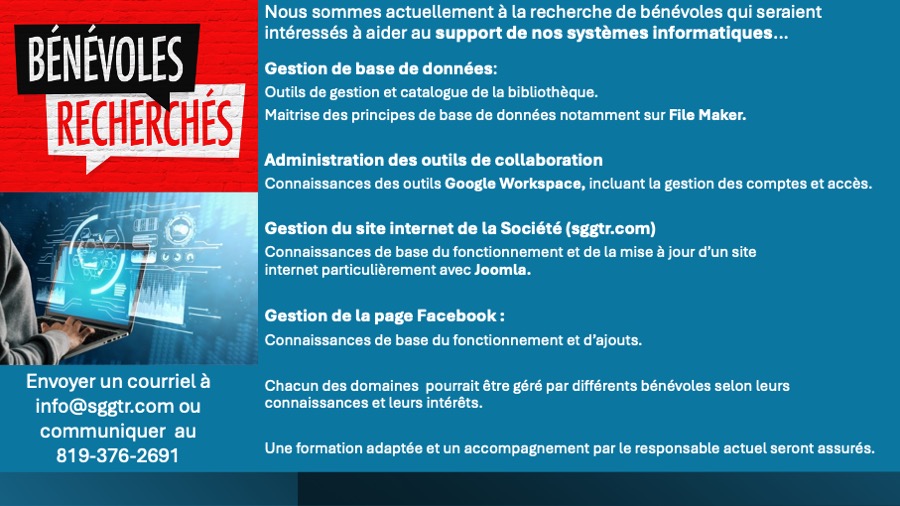 Nous sommes actuellement à la recherche de bénévoles qui seraient intéressés à aider au support de nos systèmes informatiques... et pas besoin d'être un expert. Il faut simplement vouloir s'impliquer à la Société de généalogie du Grand Trois-Rivières et avoir des connaissances de base dans les domaines suivants: